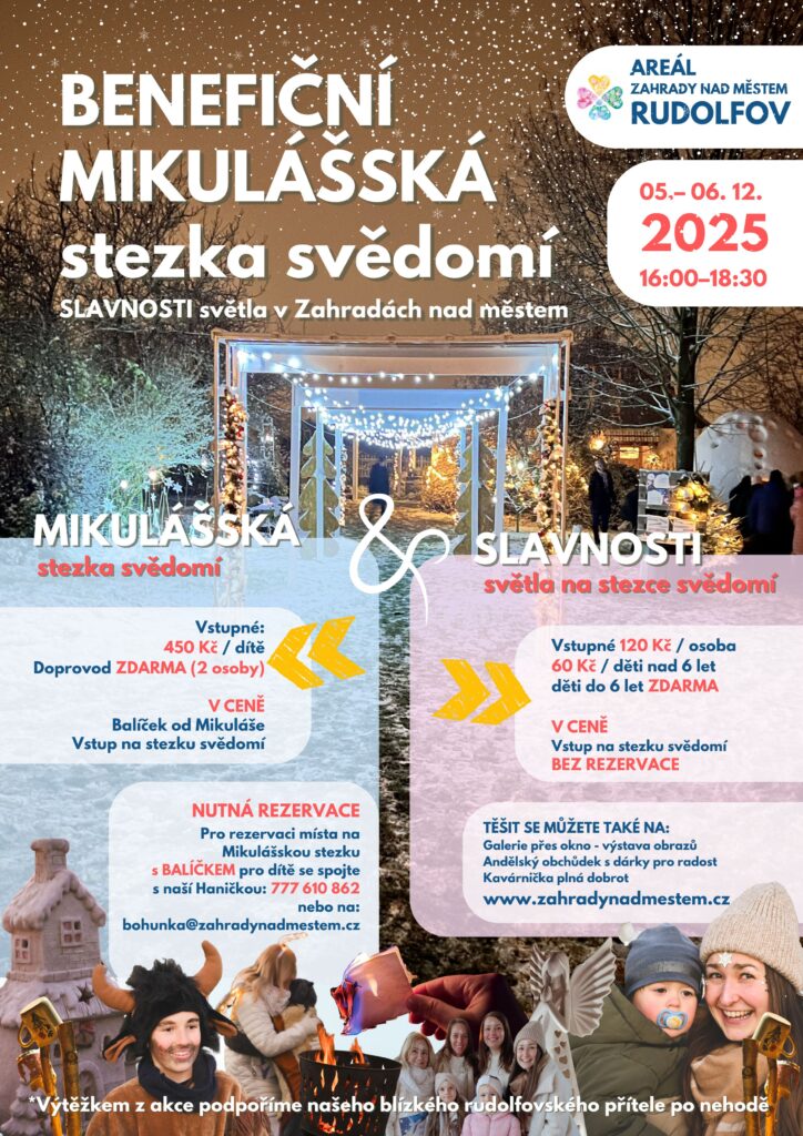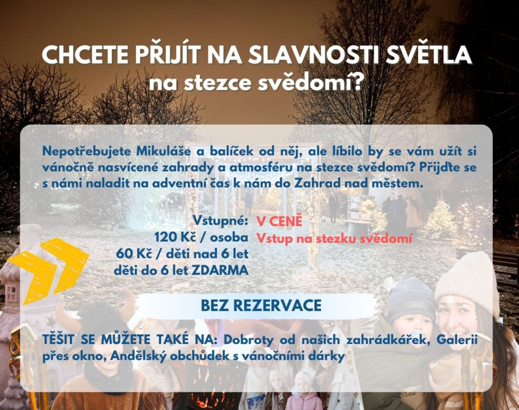 Přijďte s dětmi za Mikulášem, v ceně 450 Kč, je vstup pro dítě, program na stezce svědomí, doprovod zdarma (2 osoby) a u Mikuláše dostane vaše dítko balíček. V tomto případě je nutná rezervace u naší Haničky: 777 610 862, nebo na email u naší Bohunky: bohunka@zahradynadmestem.cz UZÁVĚRKA PŘIHLÁŠEK 30.11.2025. Kapacita omezená.