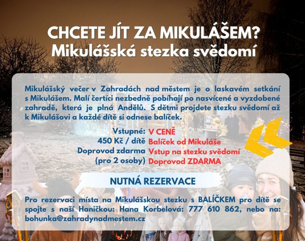 Přijďte s dětmi za Mikulášem, v ceně 450 Kč, je vstup pro dítě, program na stezce svědomí, doprovod zdarma (2 osoby) a u Mikuláše dostane vaše dítko balíček. V tomto případě je nutná rezervace u naší Haničky: 777 610 862, nebo na email u naší Bohunky: bohunka@zahradynadmestem.cz UZÁVĚRKA PŘIHLÁŠEK 30.11.2025. Kapacita omezená.